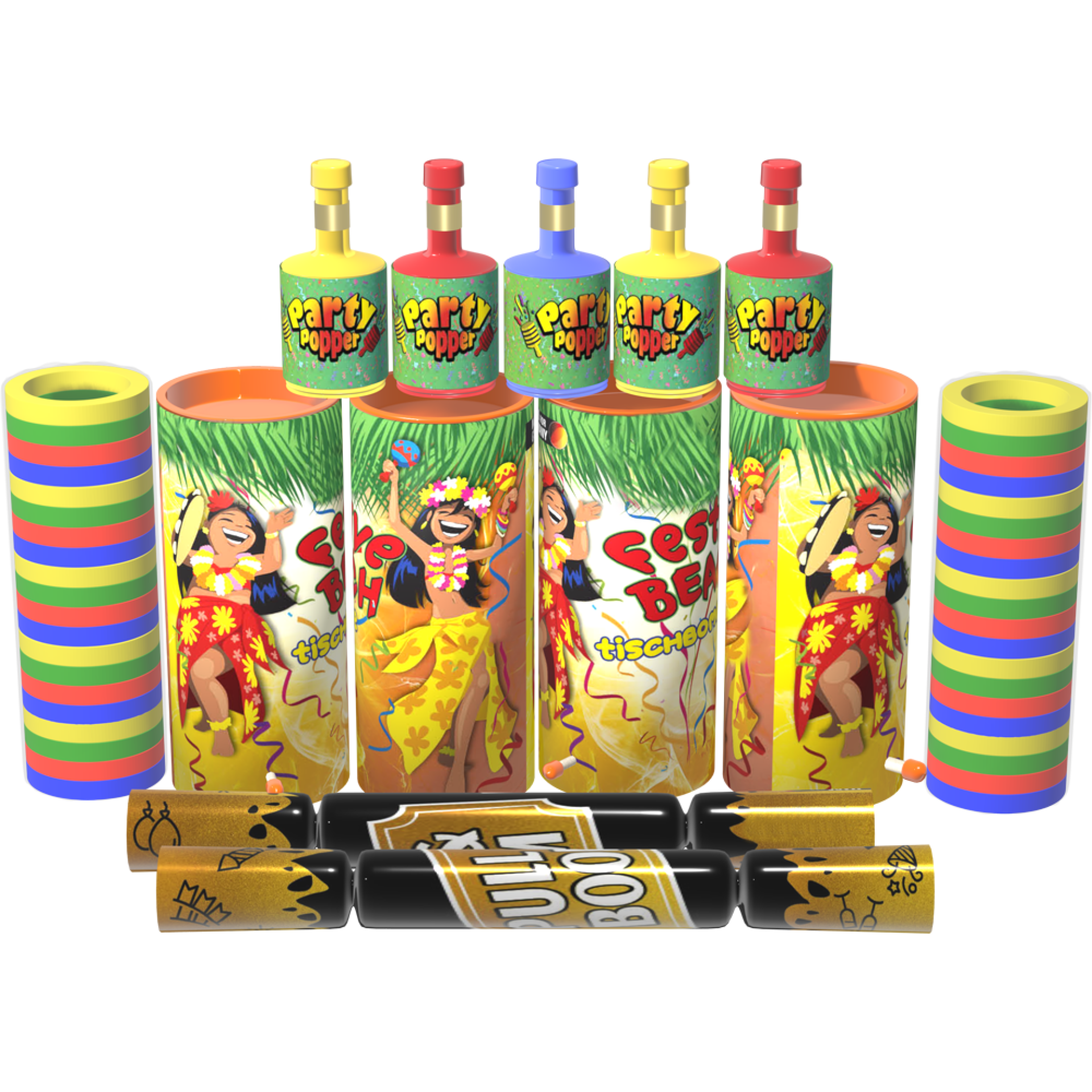 Kleurrijke slingers, tafelbangers, champagnebangers en crackers in een goedkope set.